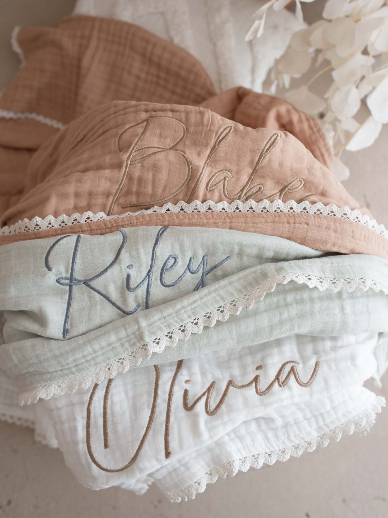 Lullaby Lace - Personalised Muslin Gauze Blanket - White
